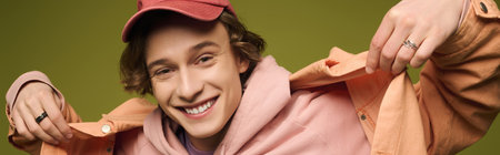 A youthful man displays his modern fashion sense with confidence in a vibrant studio setting.
