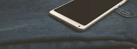 White screen smartphone in jeans pocket. Smartphone place for text. Smartphone in a pocket on a black background. Copy Space