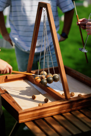 Wooden pendulum structure with multiple spherical weights hanging from chains, some metallic and some wooden, set on a wooden table. People around the structure, one holding a stick