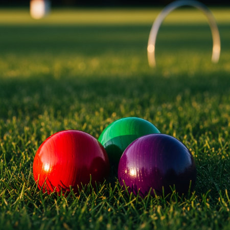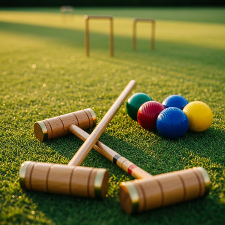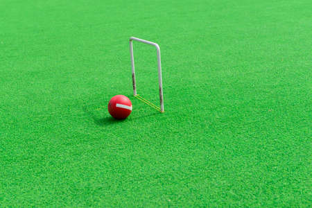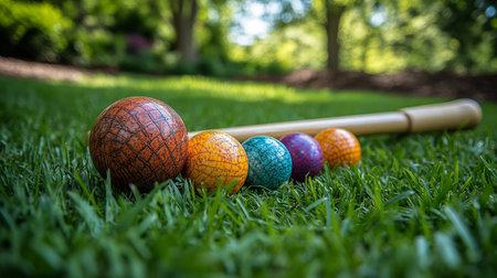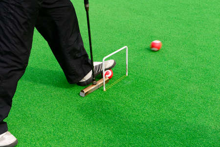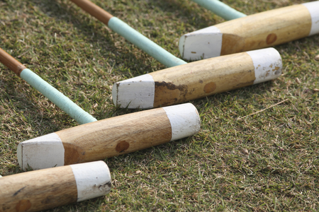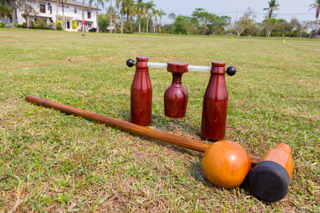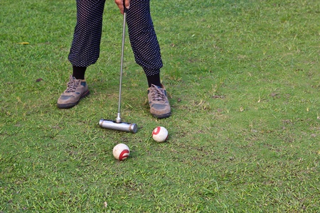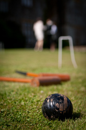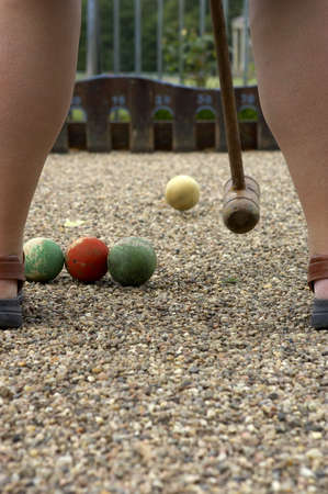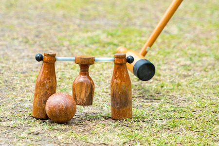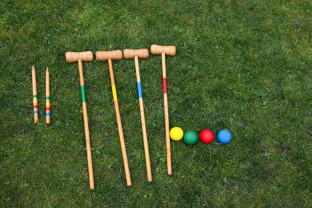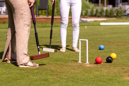 Croquet outdoor game on a lawn in the summer with a mallet and colorful balls