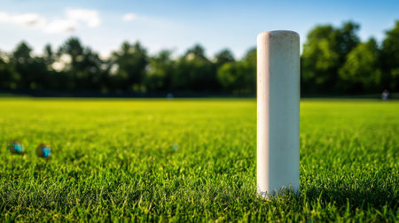 A simple white marker post stands prominently on a lush green grass field, illuminated by warm sunlight under a clear blue sky, evoking a sense of tranquility.