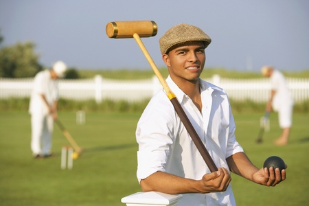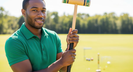 Man holding croquet mallet on sunny green lawn with blurred equipment and trees in background during outdoor leisure game.