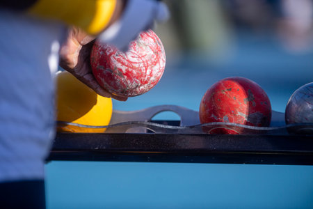 Shot put prepared for competition. Track and field background. Horizontal sport theme poster, greeting cards, headers, website and app