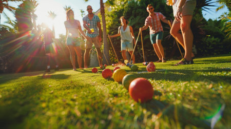 A group of friends playing a lively game of croquet on the perfectly manicured lawn glasses of mocktails in hand