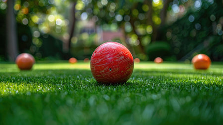 A vibrant red ball is placed on lush green grass, surrounded by trees and sunlight in a serene park. The composition captures the essence of outdoor leisure and fun.