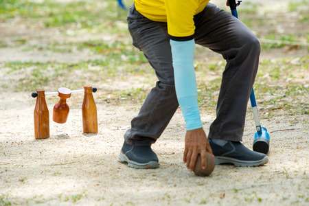A rear view shot of a senior man taking his shot in a game of lawn bowling.