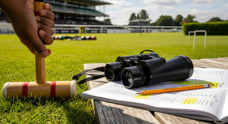 A close-up of a croquet mallet held by a hand on a lush green lawn, with binoculars and a highlighted scorecard on a wooden bench. In the background, a croquet course with balls and a racecourse grandstand are visible.