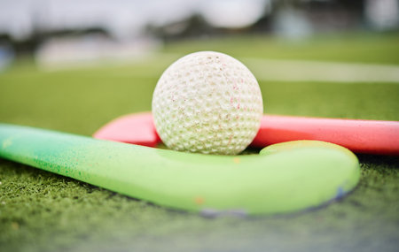 Hockey, stick and ball on a field for a game, training or exercise for sports. Closeup, ground and gear or equipment for fitness, challenge or a competition on the grass of a park for action