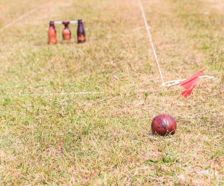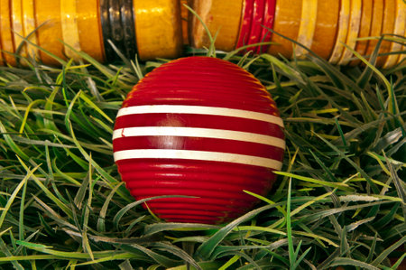 A cricket ball rests between two wooden stumps on a vibrant green grass surface, capturing the essence of cricket and its connection with nature and outdoor play.