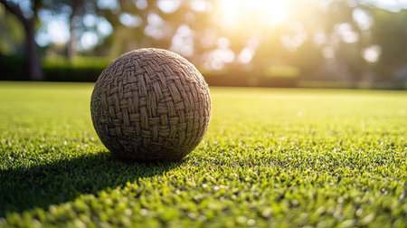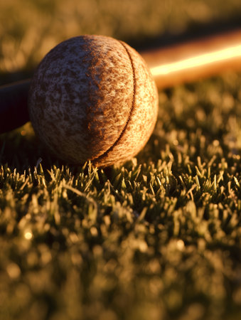 A close-up shot of a polo ball on a grassy field, with a blurred rider in the background The image captures the essence of the sport, with its focus on the ball and the rider's silhouette The golden light of the setting sun adds a warm and inviting atmosphere The image evokes a sense of speed, skill, and excitement It is perfect for use in marketing materials for polo events, equestrian publications, or any project that needs a touch of sophistication and elegance AI Generative