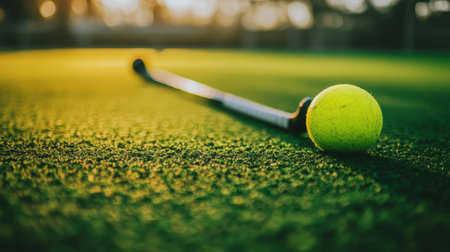 A stunning close-up view showcases a bright yellow tennis ball resting on lush green turf, accompanied by a tennis racket set against a soft, glowing sunset backdrop.
