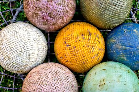 A whimsical arrangement of colorful fitness balls stacked on top of each other, creating a playful and dynamic visual display.
