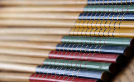 Old well-used Croquet mallets in a rack, leaning against a wooden wall, at a downward angle