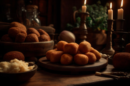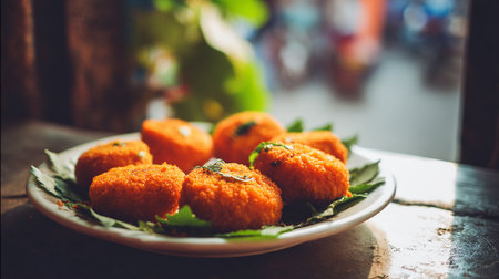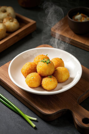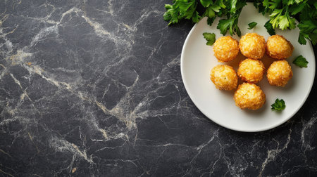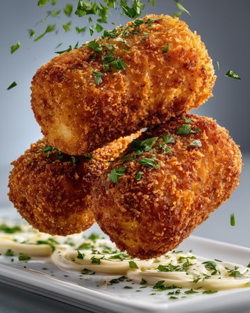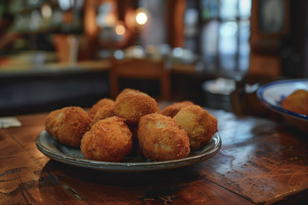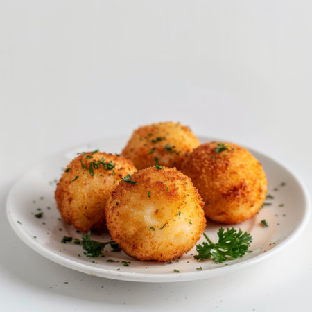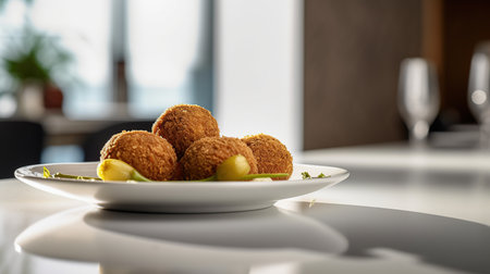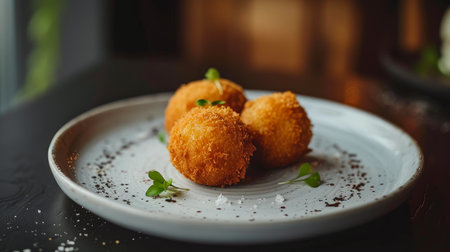 Savory fried croquettes served on a decorative plate, perfect for food and culinary themes