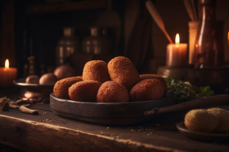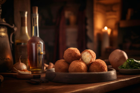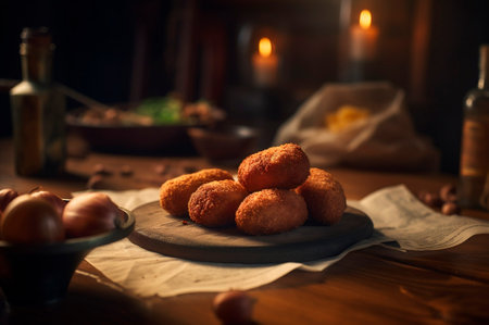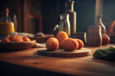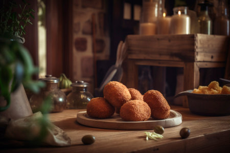 Delicious homemade croquettes on wooden table in rustic kitchen background. AI generated. closeup