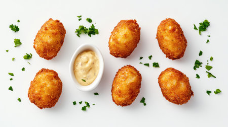 Top view of Spanish croquetas with aioli, with ample copy space on a clean white background.