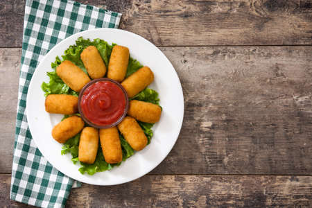 Traditional Spanish fried croquetas (croquettes) With Ketchup in plate on wooden background