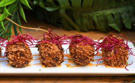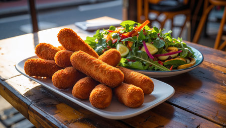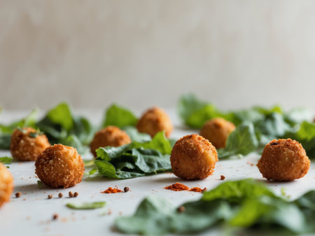AI Generated. Delicious Crispy Potato Croquettes with Spinach and Arugula
