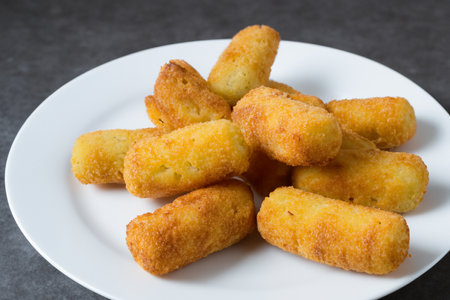 Plate homemade fried POTATO CROQUETTES close up