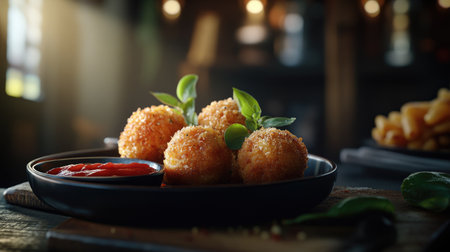 A tempting presentation of arancini served with dipping sauces, with a clean, blurred background offering generous copy space for promotional content or recipe descriptions.