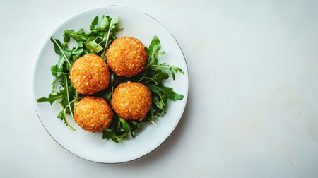 A mouthwatering shot of arancini rice balls, beautifully plated with fresh greens, on a simple background providing ample copy space for culinary branding or descriptive text.