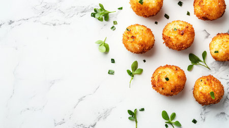 A beautifully arranged close-up of delicious arancini garnished with fresh herbs on a marble background, perfect for showcasing Italian cuisine and appetizers.