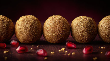 An exquisite display of round brown sweet balls coated in a golden dust, elegantly arranged on a dark surface with vibrant red garnishes, perfect for enticing food photography.