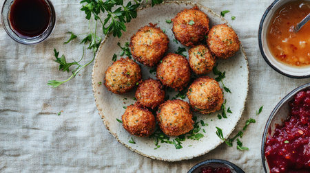 An artistic shot of fried meatballs placed on a textured tablecloth, accompanied by colorful sauces and garnished with fresh herbs, creating an inviting dining experience
