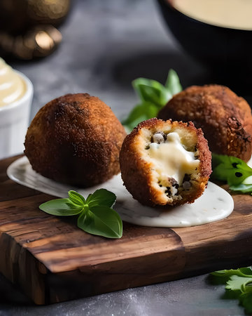 A luxurious truffle arancini, perfectly crispy on the outside and creamy inside, served with a garlic aioli dip