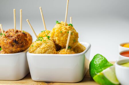 Various mini chicken kievs and sweet potato falafels served with sauces, banquet food
