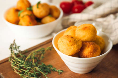 Bowl with fried potato balls on light background