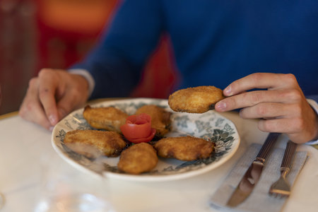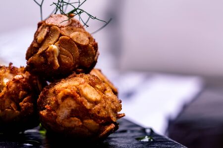 Delicious croquettes stuffed with salty prawns and a lot of coarse salt served as tapas in a Spanish restaurant with a brown metal surface table