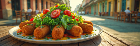 Croquettes with green salad and fresh vegetables on a table in a street cafe, Cuba traditional food
