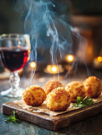 Delicious Hot Crispy Fried Cheese Balls or Arancini Served on a Wooden Board with Fresh Parsley, and Rising Steam with a Glass of Red Wine and Warm Bokeh Lighting in a Cozy Restaurant Background