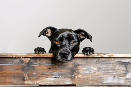 cute black dog behind a wooden fence