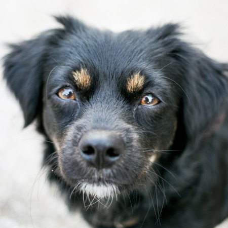 Portrait of a mixed breed dog looking at the camera with a sad expression