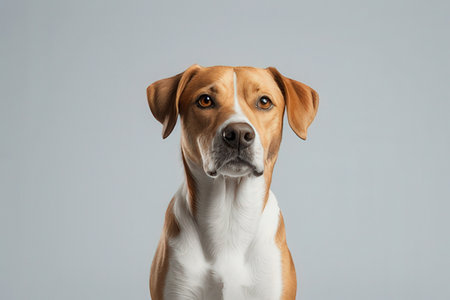 Attentive mixed-breed dog gazes away, Studio capture.