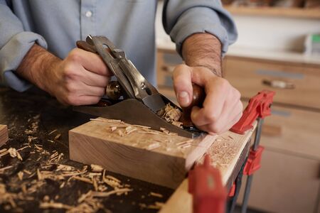 Carpenter at work, he is carving wood using a woodworking tool, hands close up, carpentry and craftsmanship concept