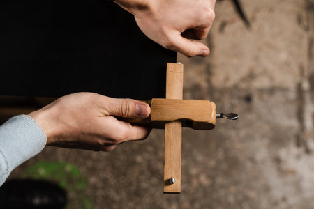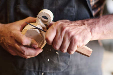 Close-up of woodcarvers hands shaping a wooden object with a carving tool, showcasing craftsmanship and skill, perfect for woodworking and artisan projects, natural light.