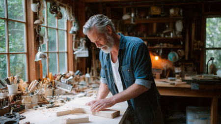 Woodworker creating a handcrafted project in a cozy workshop surrounded by tools