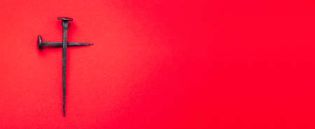 Cross made with rusty nails and drops of blood on red background. Copy space. Good Friday, Easter day. Christian backdrop. Biblical faith, gospel, salvation concept. Crucifixion of Jesus Christ