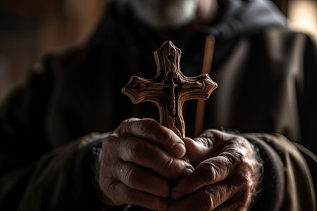 Church priest holds religious cross in hands, close up. Prayer in church. Concept of faith in God. Created with Generative AI