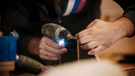 carpenter use drill bit and centering dowel jig tool to make strong joints . woodworking concept.selective focus.