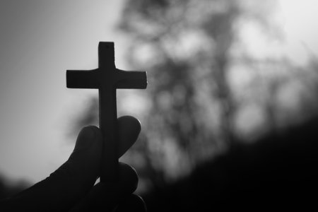 Silhouette of human hands holding a cross holy
