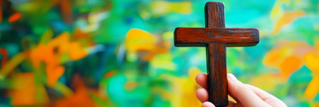 A close-up of a hand holding a wooden cross, surrounded by a blurred colorful background, conveying hope, faith, and spiritual devotion in an ethereal style, banner