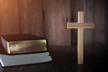 Bible and cross on a wood background. Study Bible worship concept.