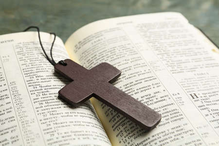 Close up of wooden Christian cross on bible