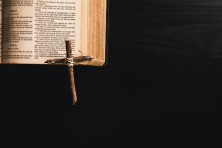 A wooden homemade cross made of branches tied with a rope lies on a book on a black cloth, prays, faith in God and religion