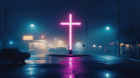 A striking neon pink cross stands tall in a foggy, deserted area at night, casting a vibrant glow on the wet pavement. This image captures a blend of spirituality and urban atmosphere, evoking a sense of mystery and contemplation