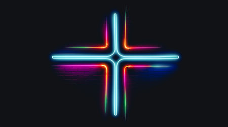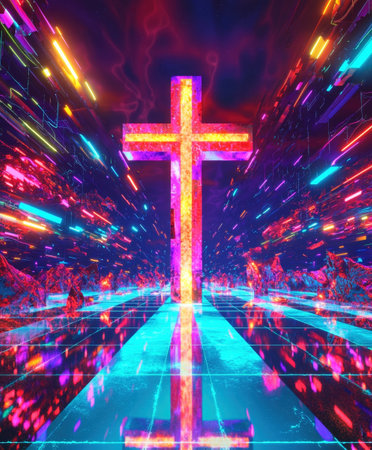 Mesmerizing digital artwork depicting a luminous neon like cross suspended in a 3D landscape of vibrant ever changing patterns and hues creating a captivating transcendent visual experience